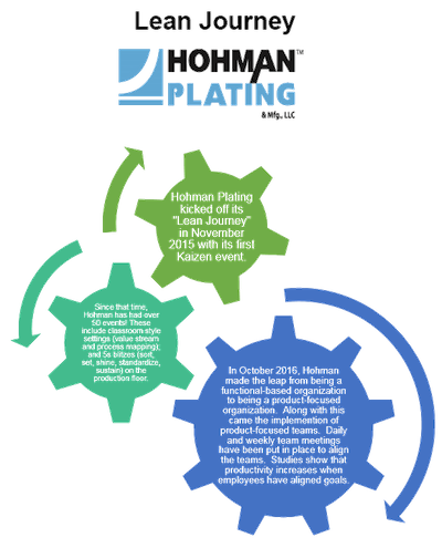 Nearly a year and a half ago, Hohman Plating began the journey of Lean Manufacturing. In that time, we have made significant changes that have improved productivity.